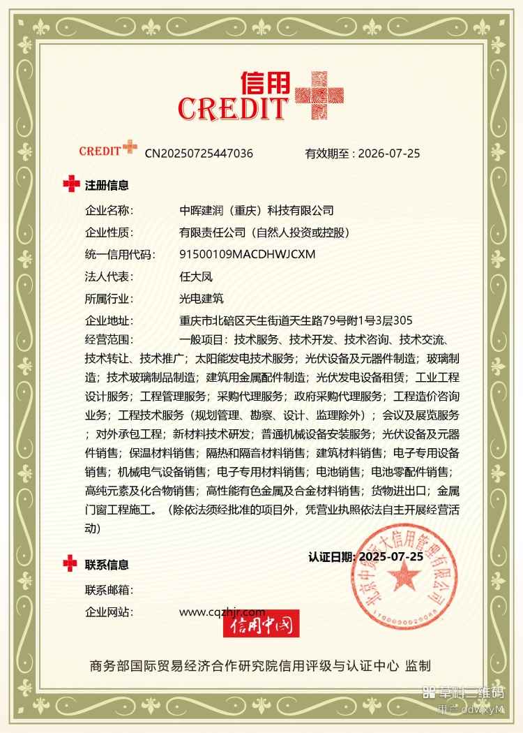 中晖建润始终致力于引领绿色科技前沿,在全球范围推广领先的“碲化镉发电玻璃”、“绿色禾塑复合材料”和“无电亮化物联智控系统”三大核心技术产品。依托“融投-设计-建设-运维”的全周期解决方案能力,我们为绿电直连项目提供坚实可靠的全链条服务。作为低碳技术推广的先行者,公司不仅主导编制了《零碳企业评价规范》等行业标准,更以中国国土经济学会光电建筑委员会专家团队为强大技术后盾,深度参与国际技术交流,持续推动绿色建筑革命。旗下品牌“中晖禾屹”凭借重庆市科技型企业资质及行业影响力,正加速突破市场认知,探索绿电项目规模化落地的新模式与新路径。