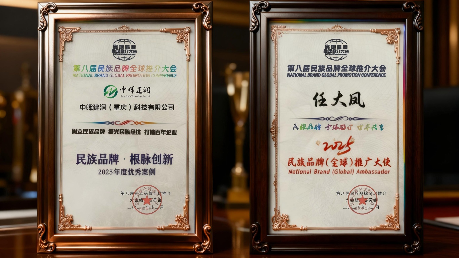 中晖建润(重庆)科技有限公司凭借其在绿色建材与新能源建筑领域的持续创新与卓越贡献,在会上斩获多项重要荣誉,充分展现了新时代中国民族品牌的科技实力与国际担当。